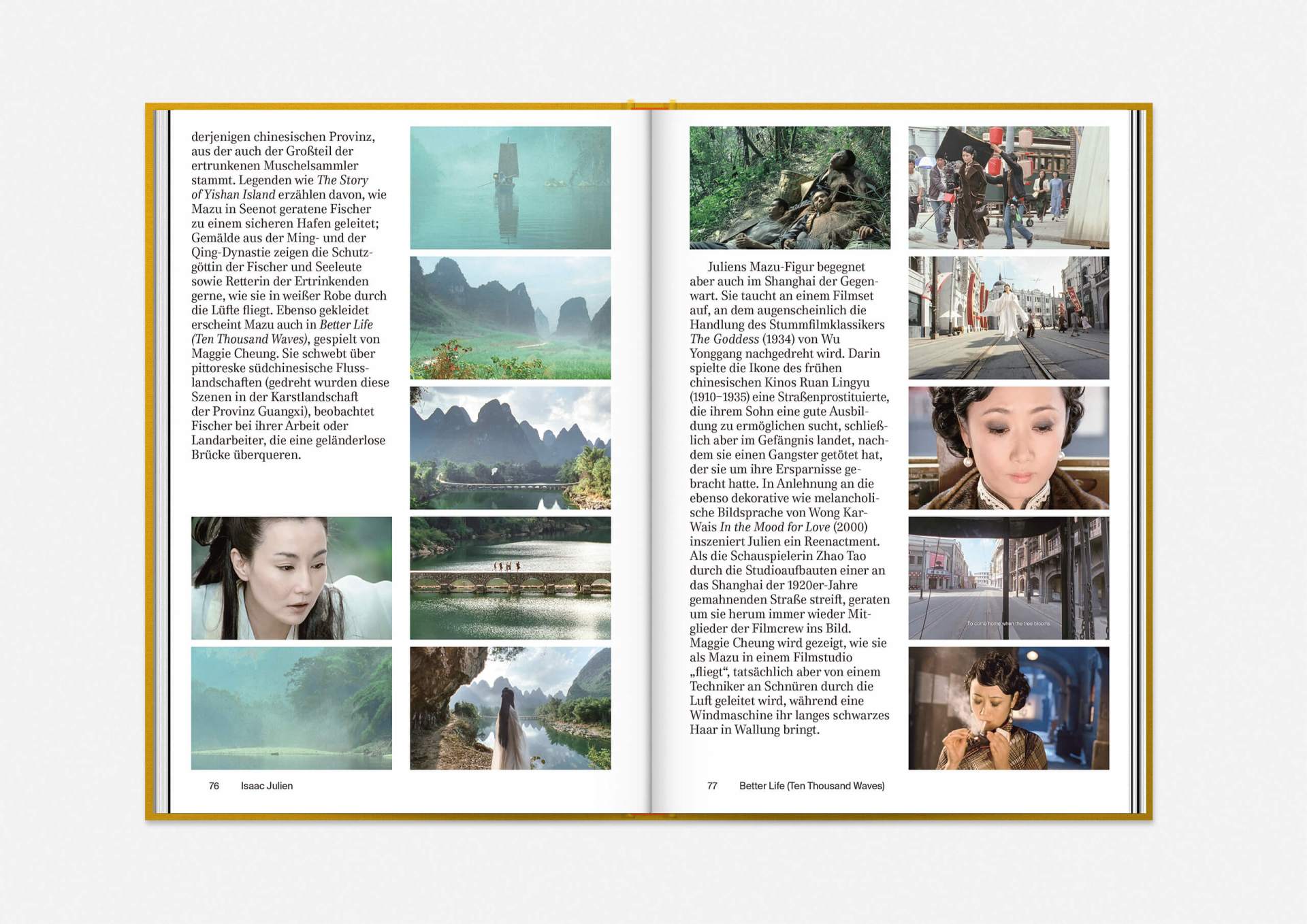 While the printed, celluloid-like cover is a vivid combination of images and captions, the film stills of the works represented in the collection are arranged vertically as if in a film strip. The white spaces that separate the images are reminiscent of the editing process.