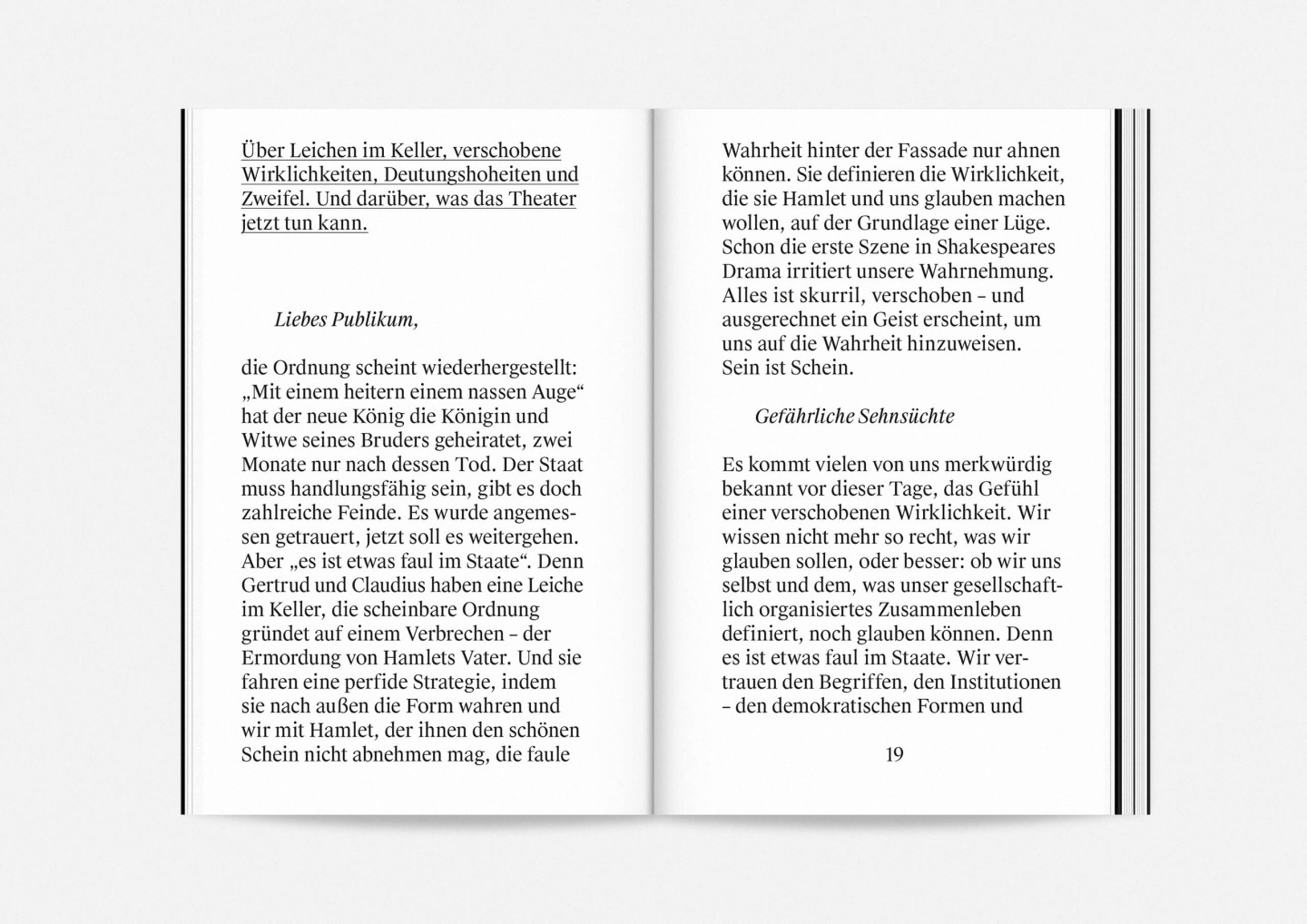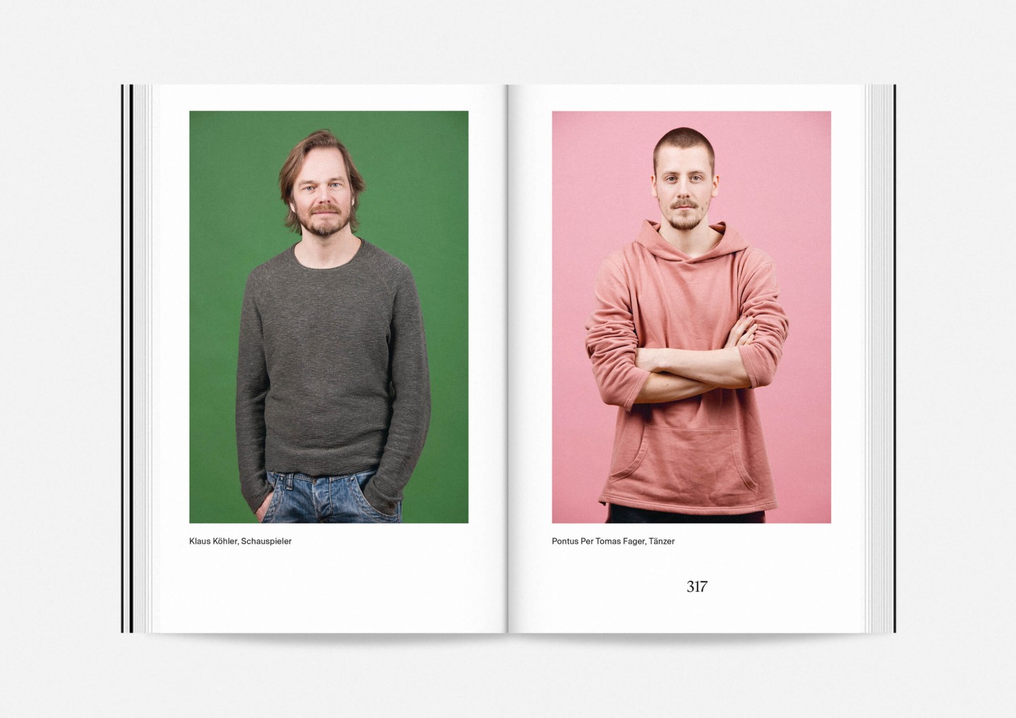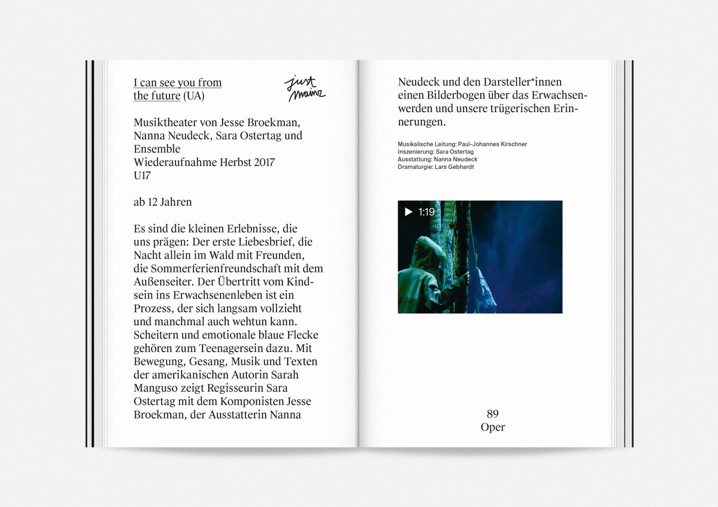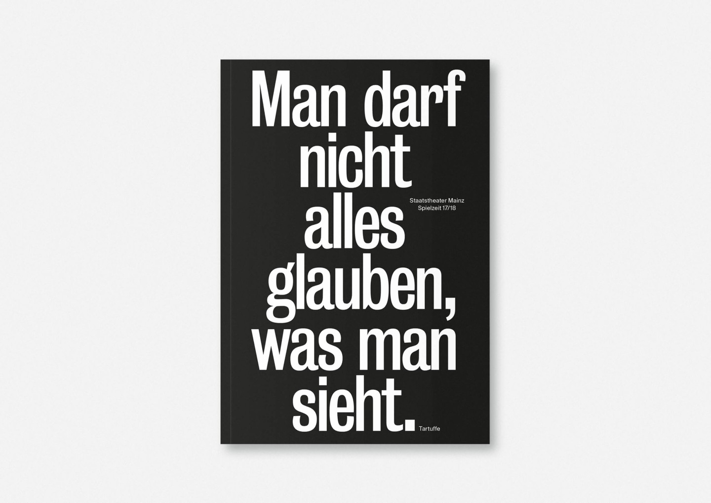 The season program 2017/18 of Staatstheater Mainz (Mainz State Theatre) opens with an impressive collection of photographs of its members, purposefully presented in no hierarchical order to showcase the wide array of talent both on stage and off required to make it work. The program’s strikingly compact format allows for every single face to fill an entire page and momentarily, equanimously, »take center stage«.