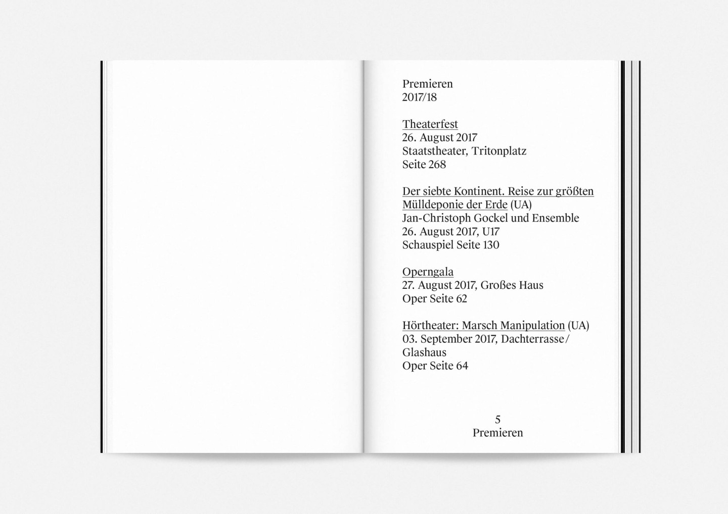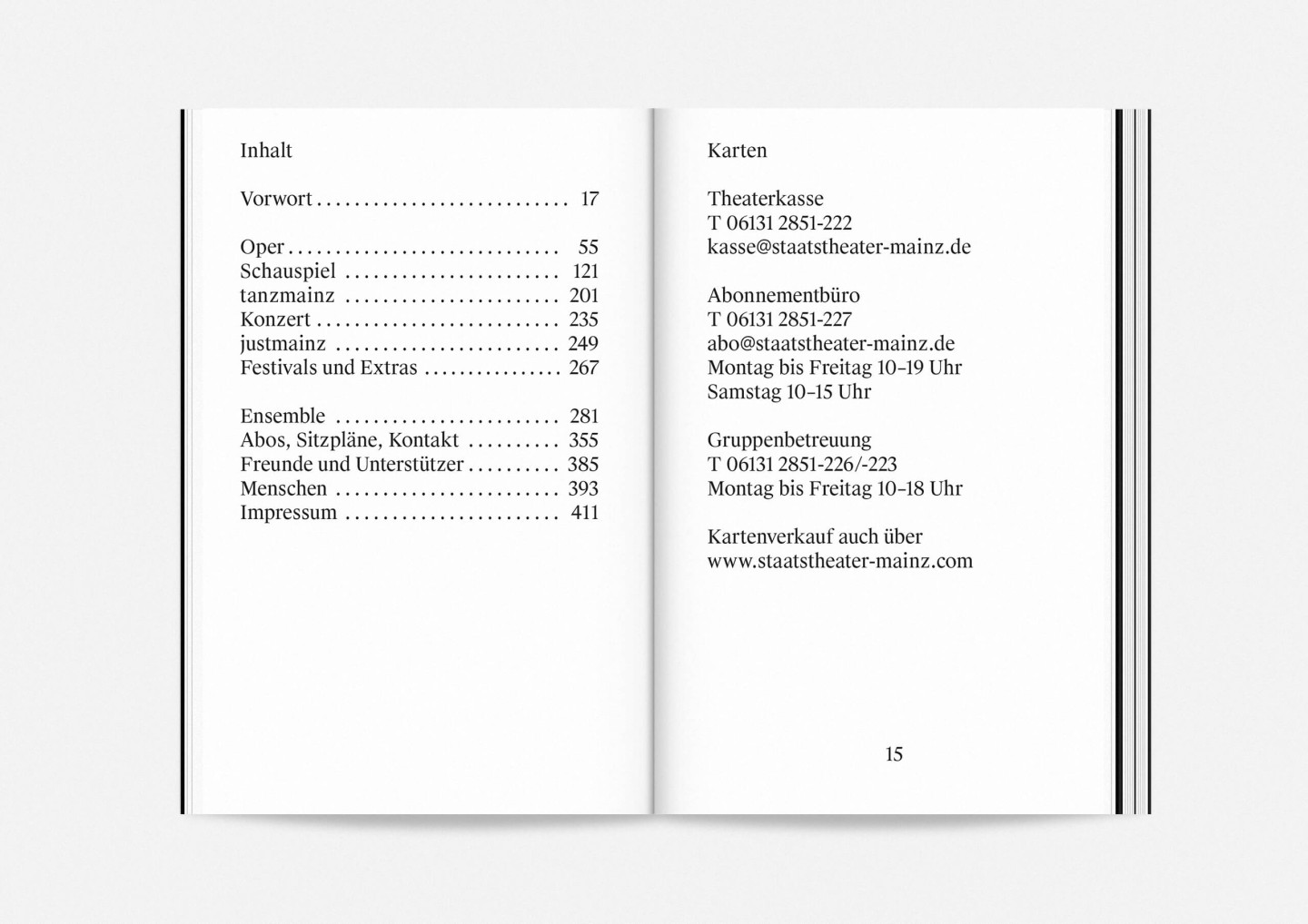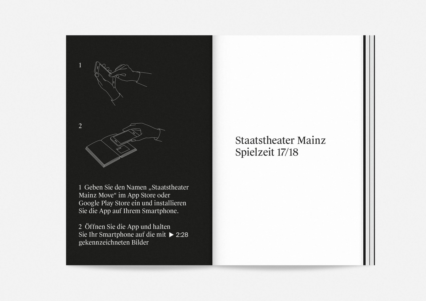 Constituting one half of the booklet — and creating its distinct half-black, half-white edge — this portrait gallery deliberately precedes the information section with details on the upcoming opera, drama, dance, and concert premieres and repertoire pieces presented in a clearly structured overview characterized by large lettering, clear graphics, and the theatre’s highly recognizable star logo. The result is a seasonal program that aims to inform and inspire, offering an immediate and deeply personal introduction to the ideas and workings of Staatstheater Mainz.