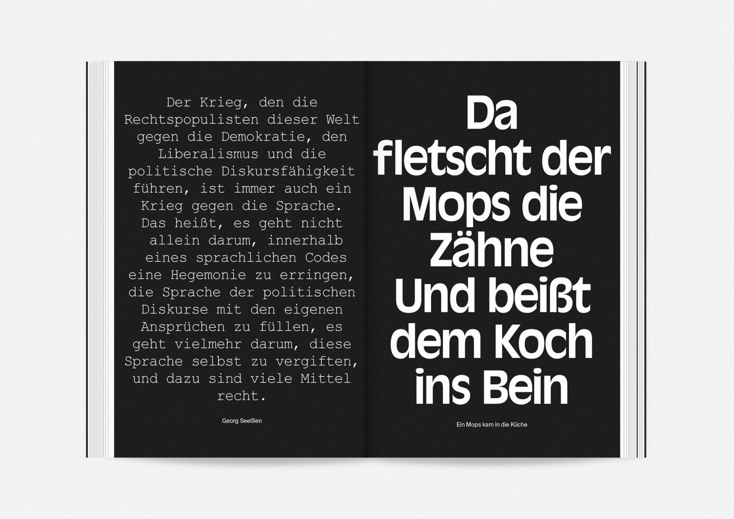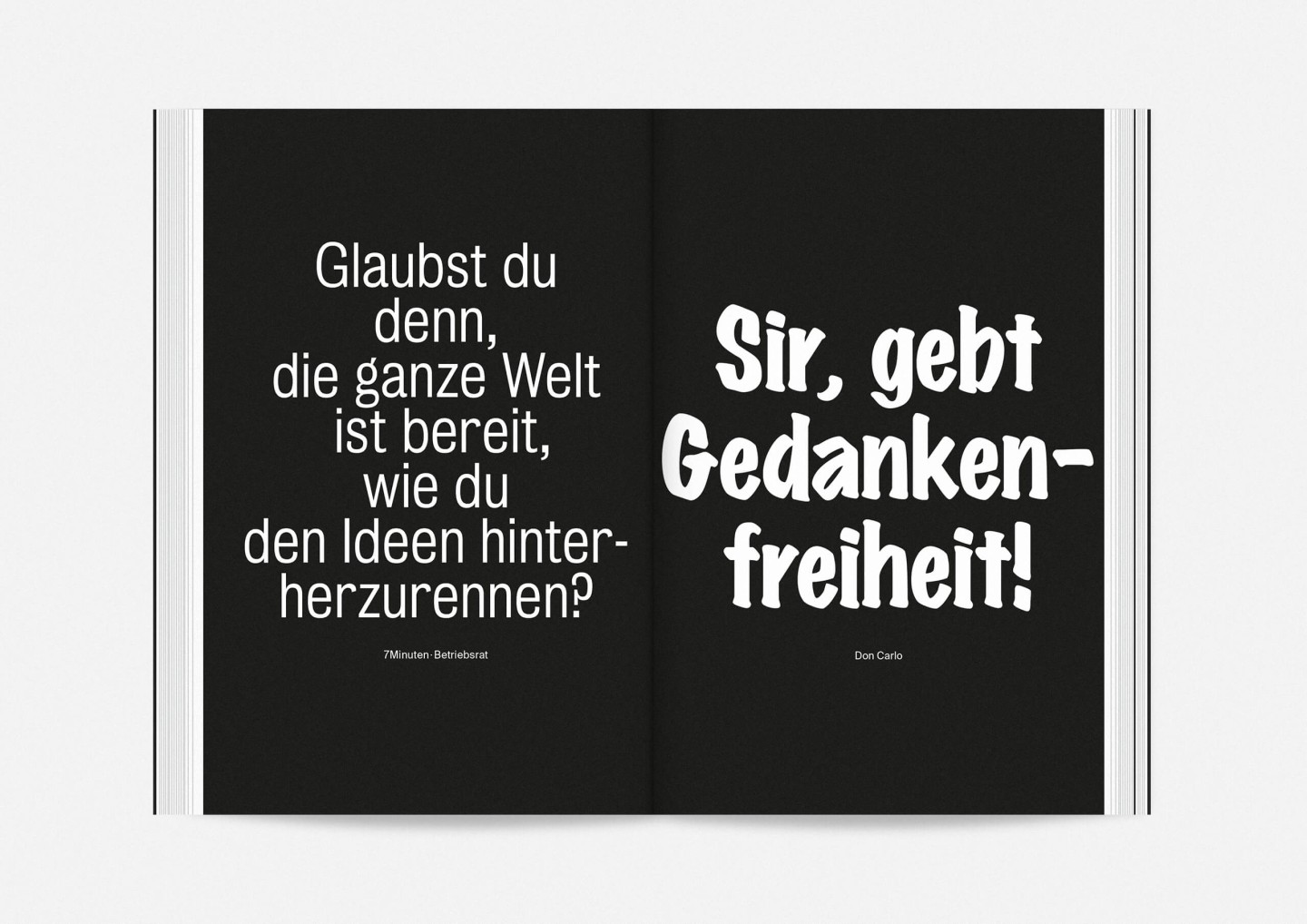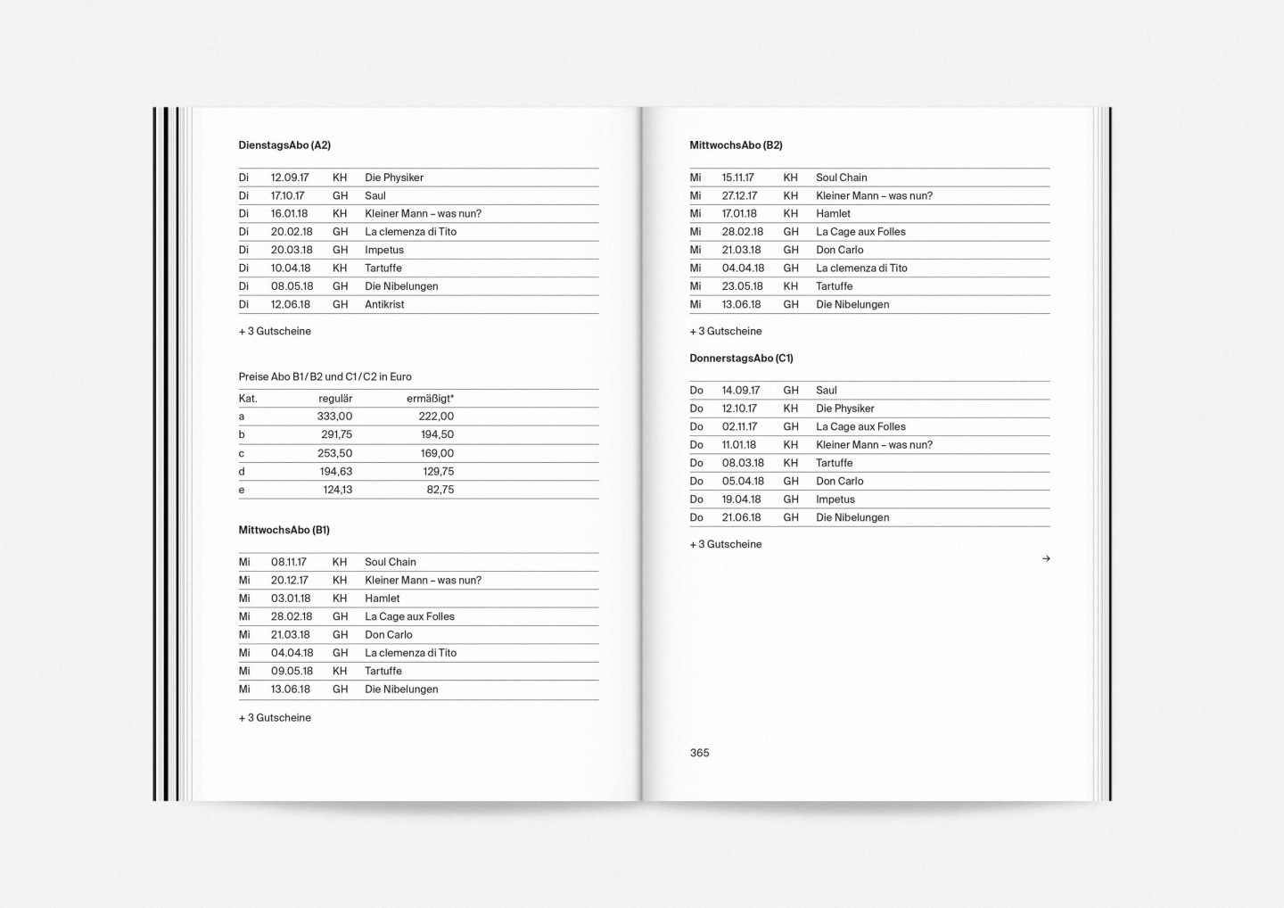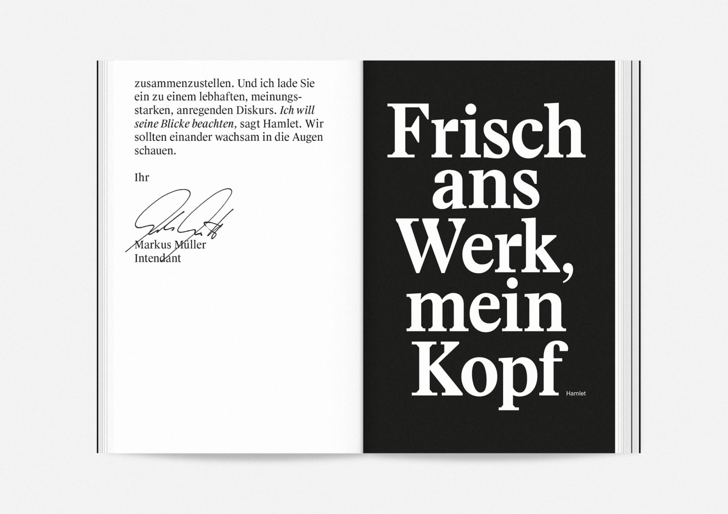 Constituting one half of the booklet — and creating its distinct half-black, half-white edge — this portrait gallery deliberately precedes the information section with details on the upcoming opera, drama, dance, and concert premieres and repertoire pieces presented in a clearly structured overview characterized by large lettering, clear graphics, and the theatre’s highly recognizable star logo. The result is a seasonal program that aims to inform and inspire, offering an immediate and deeply personal introduction to the ideas and workings of Staatstheater Mainz.