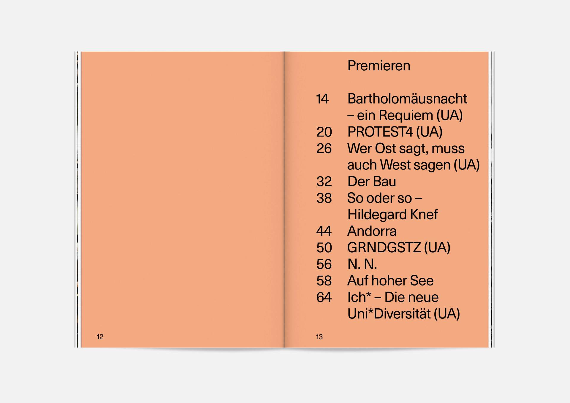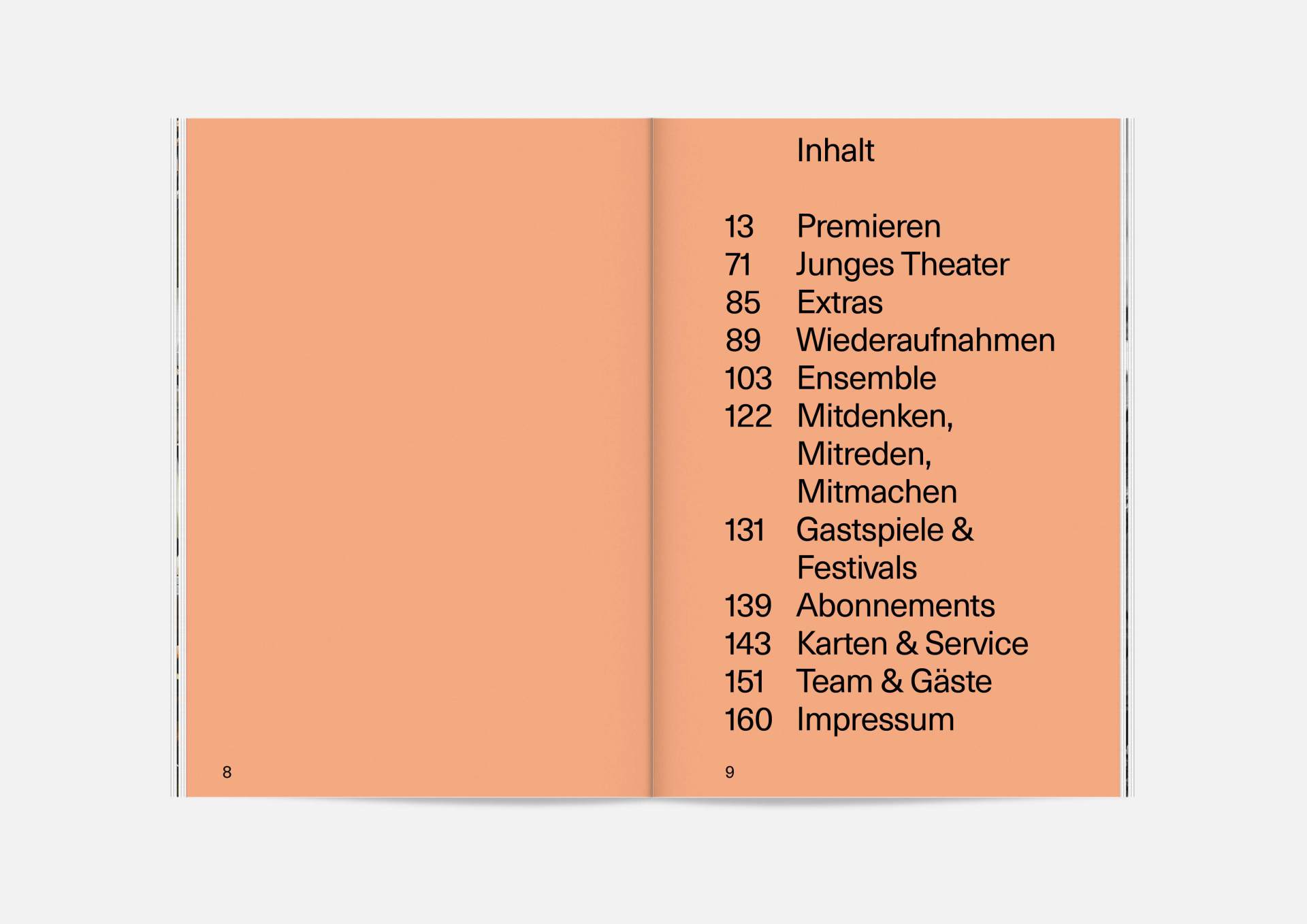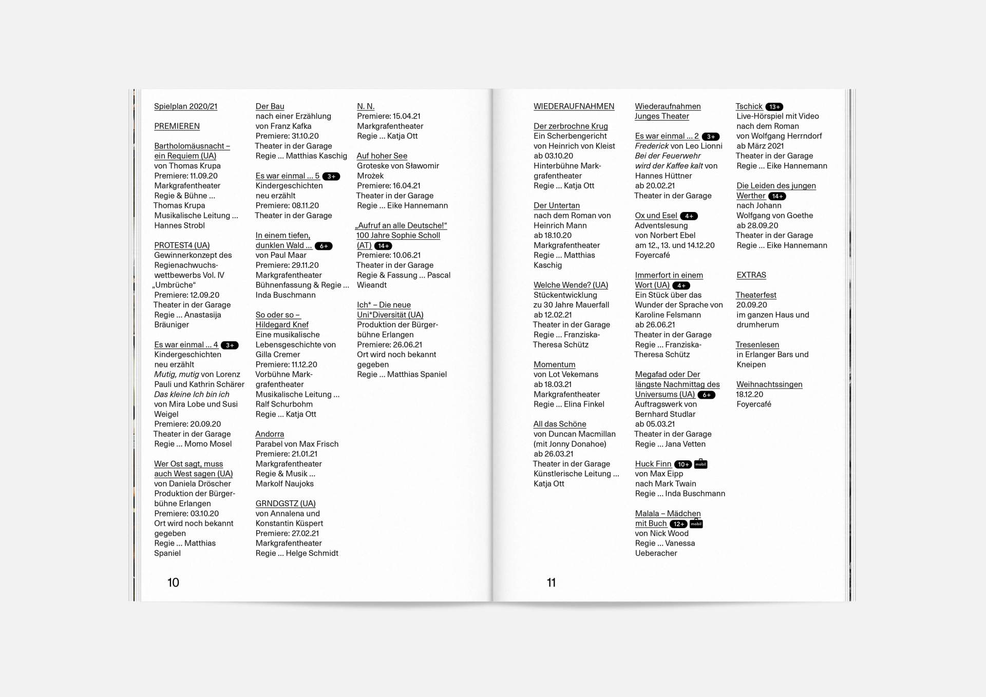 The program booklet is available for the current season 2020/21. Softcover, format 165 × 240 mm, 162 pages, font type Neue Haas Unica Pro, printed on recycled paper.