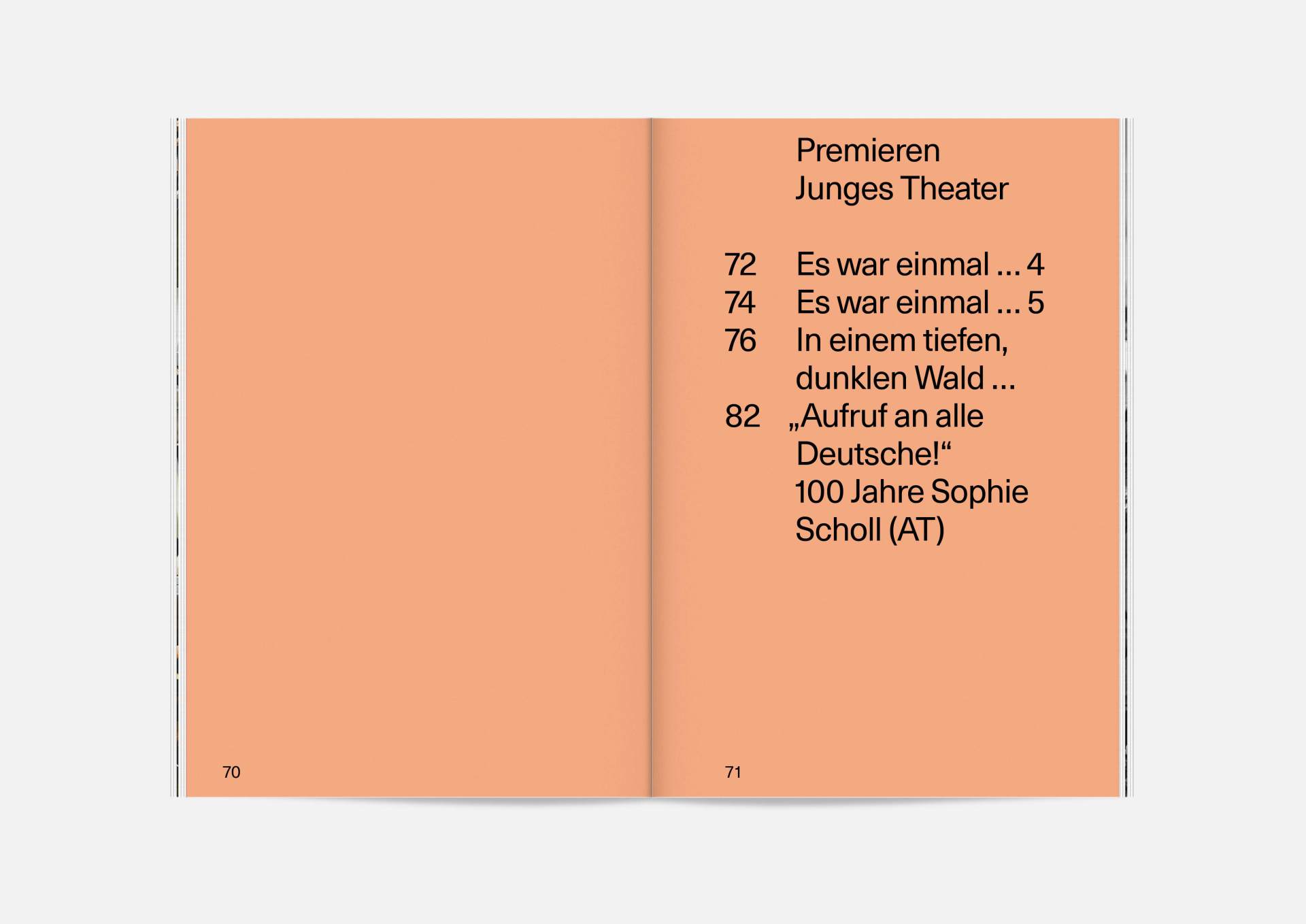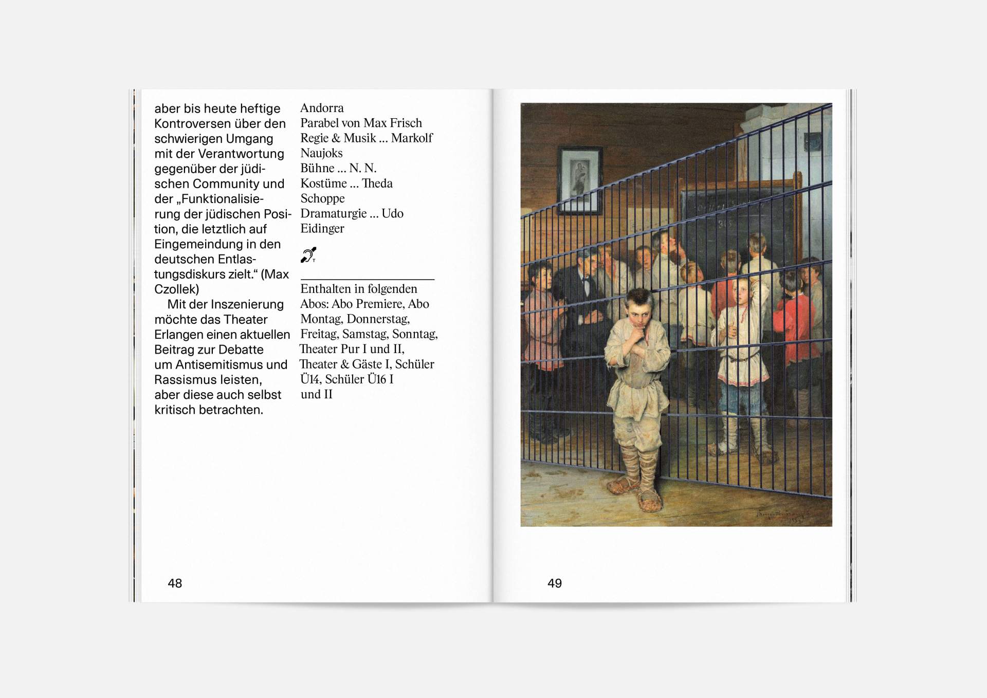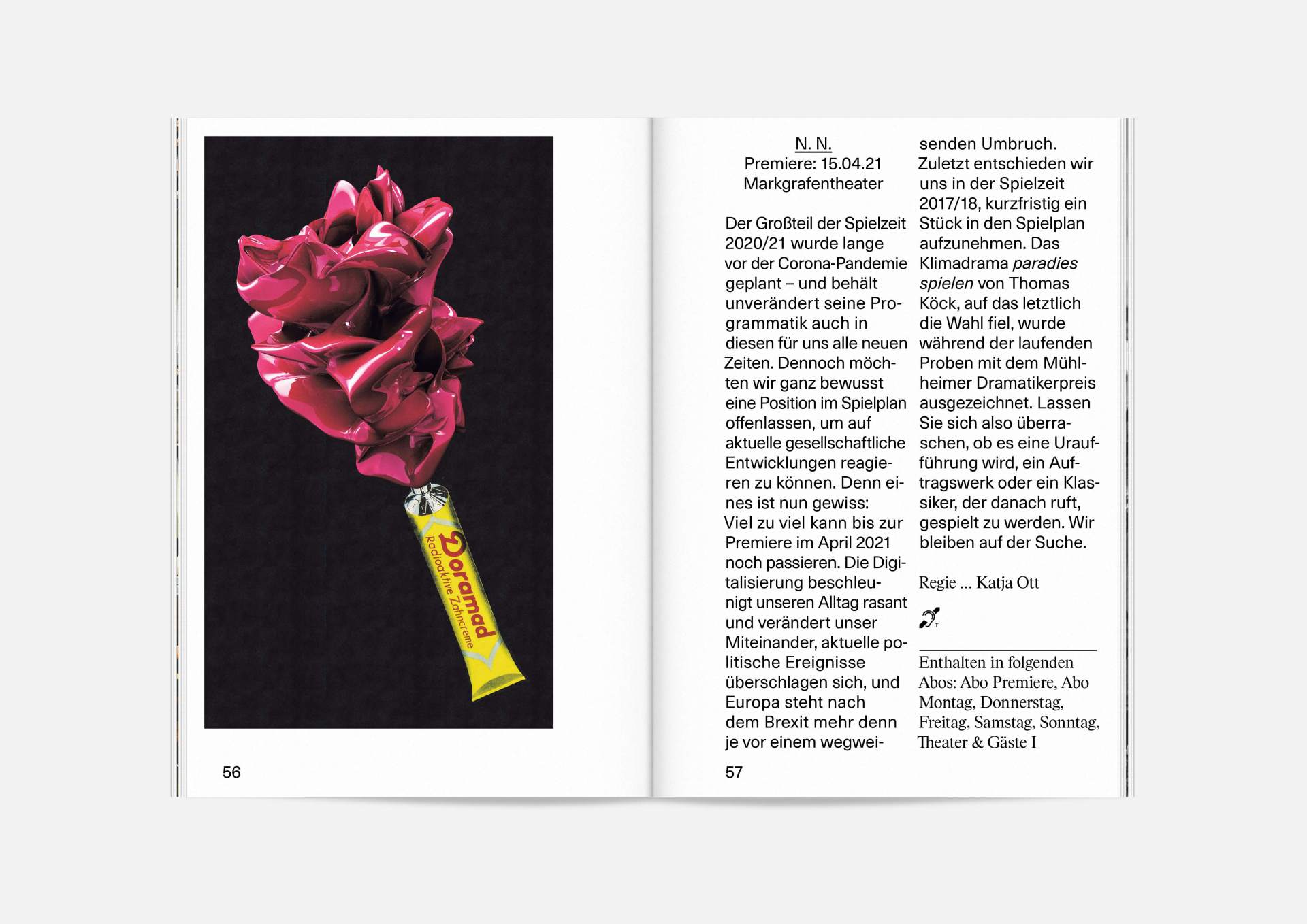 The program booklet is available for the current season 2020/21. Softcover, format 165 × 240 mm, 162 pages, font type Neue Haas Unica Pro, printed on recycled paper.