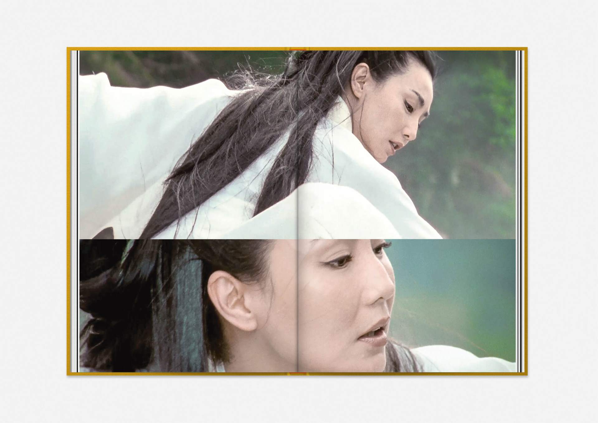 While the printed, celluloid-like cover is a vivid combination of images and captions, the film stills of the works represented in the collection are arranged vertically as if in a film strip. The white spaces that separate the images are reminiscent of the editing process.