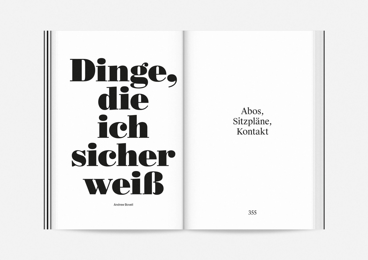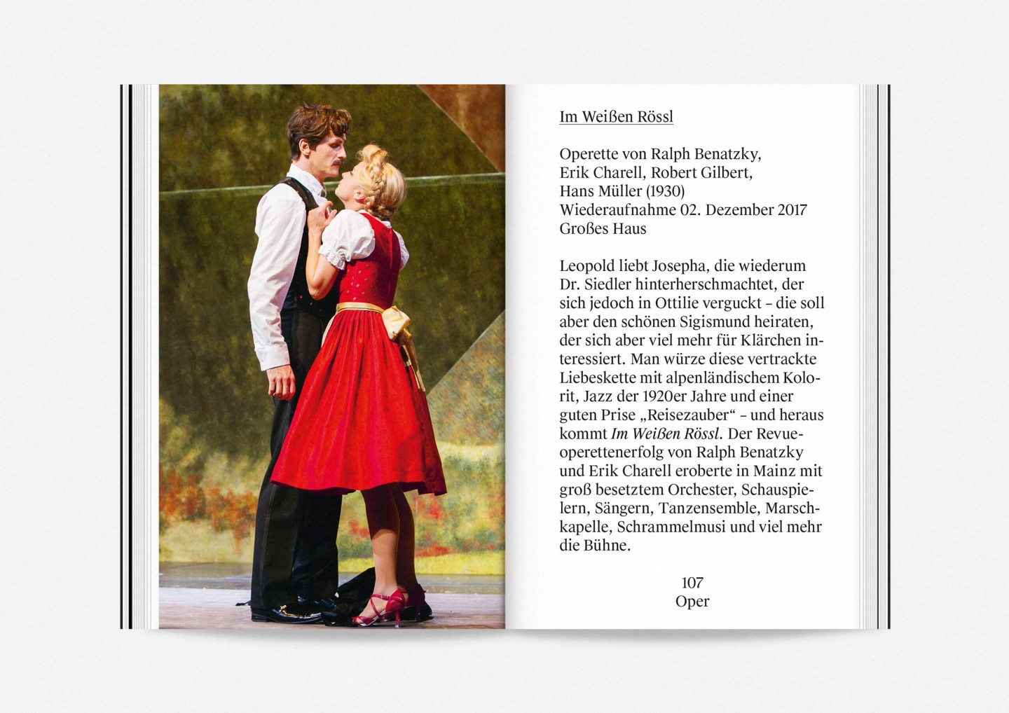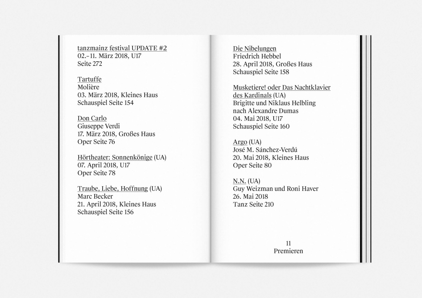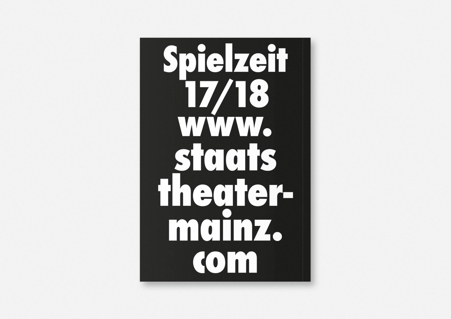 Constituting one half of the booklet — and creating its distinct half-black, half-white edge — this portrait gallery deliberately precedes the information section with details on the upcoming opera, drama, dance, and concert premieres and repertoire pieces presented in a clearly structured overview characterized by large lettering, clear graphics, and the theatre’s highly recognizable star logo. The result is a seasonal program that aims to inform and inspire, offering an immediate and deeply personal introduction to the ideas and workings of Staatstheater Mainz.
