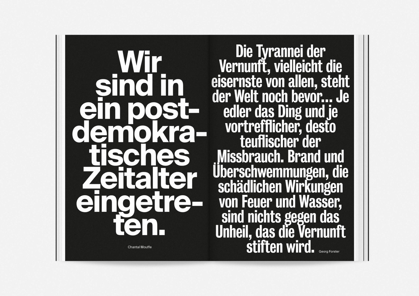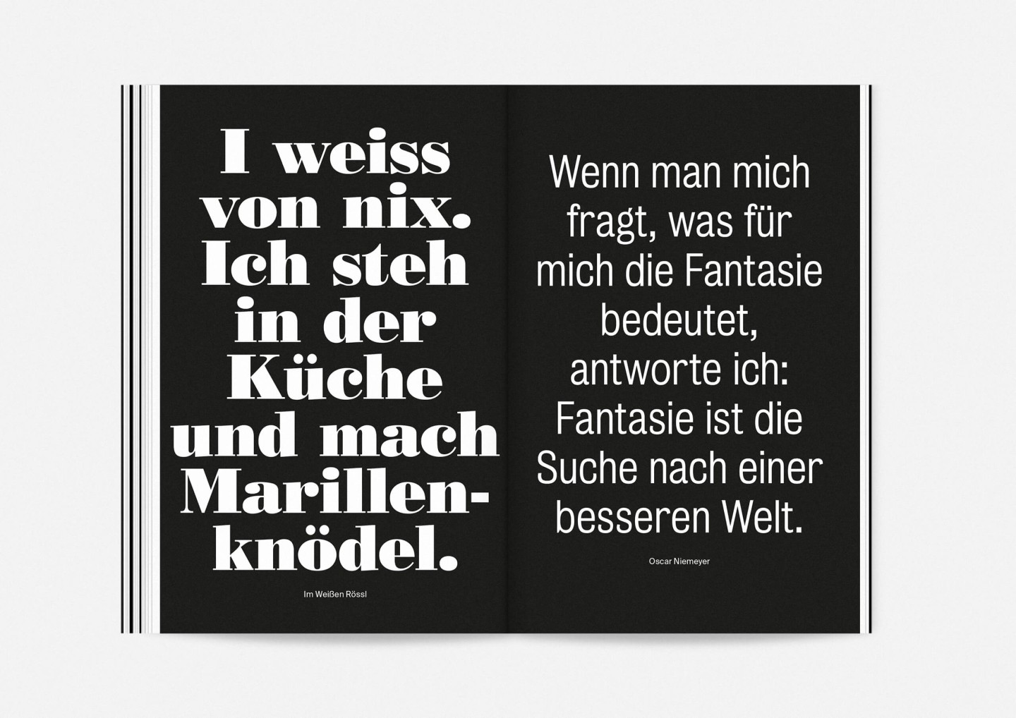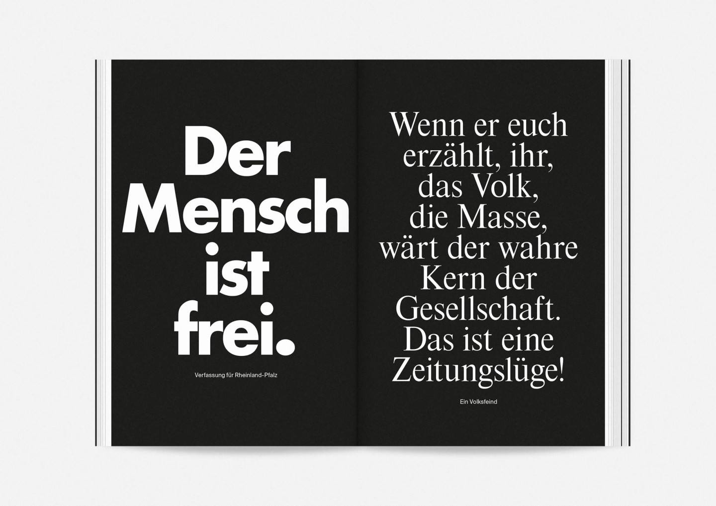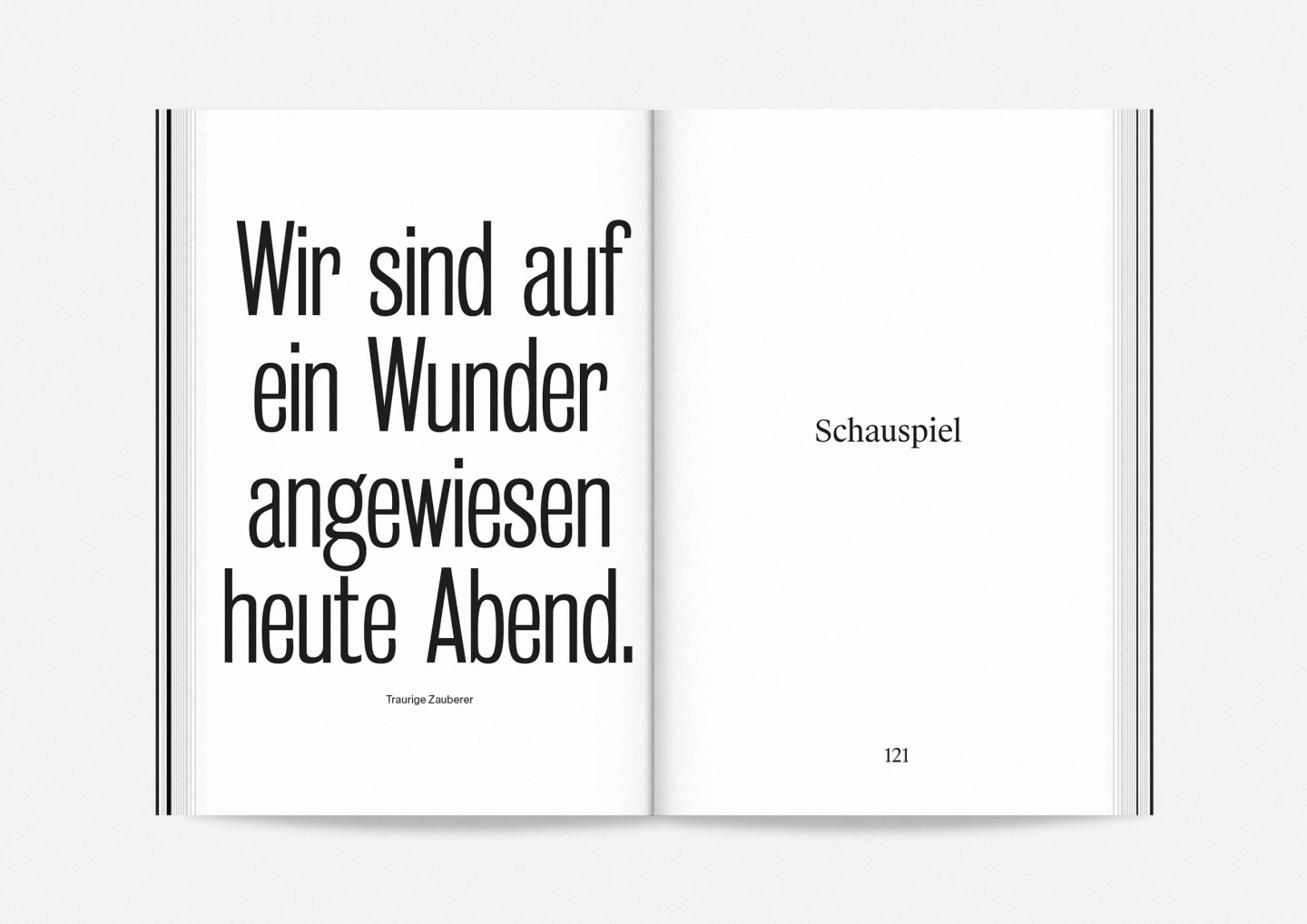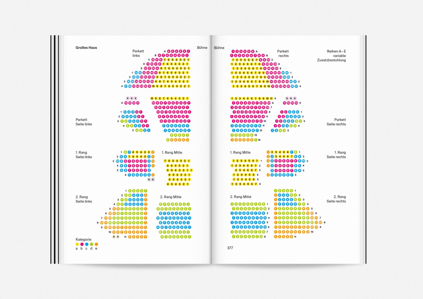 Constituting one half of the booklet — and creating its distinct half-black, half-white edge — this portrait gallery deliberately precedes the information section with details on the upcoming opera, drama, dance, and concert premieres and repertoire pieces presented in a clearly structured overview characterized by large lettering, clear graphics, and the theatre’s highly recognizable star logo. The result is a seasonal program that aims to inform and inspire, offering an immediate and deeply personal introduction to the ideas and workings of Staatstheater Mainz.