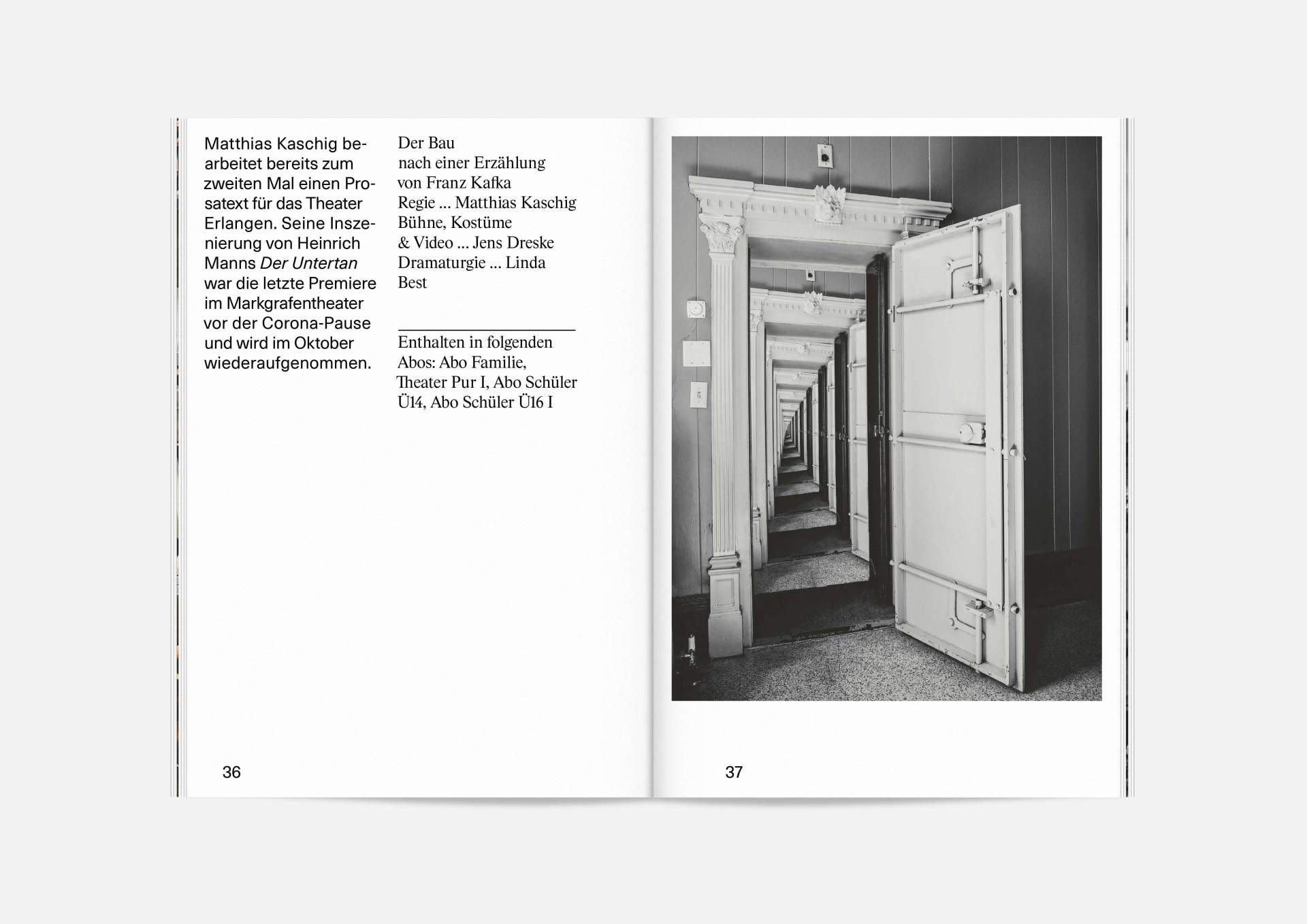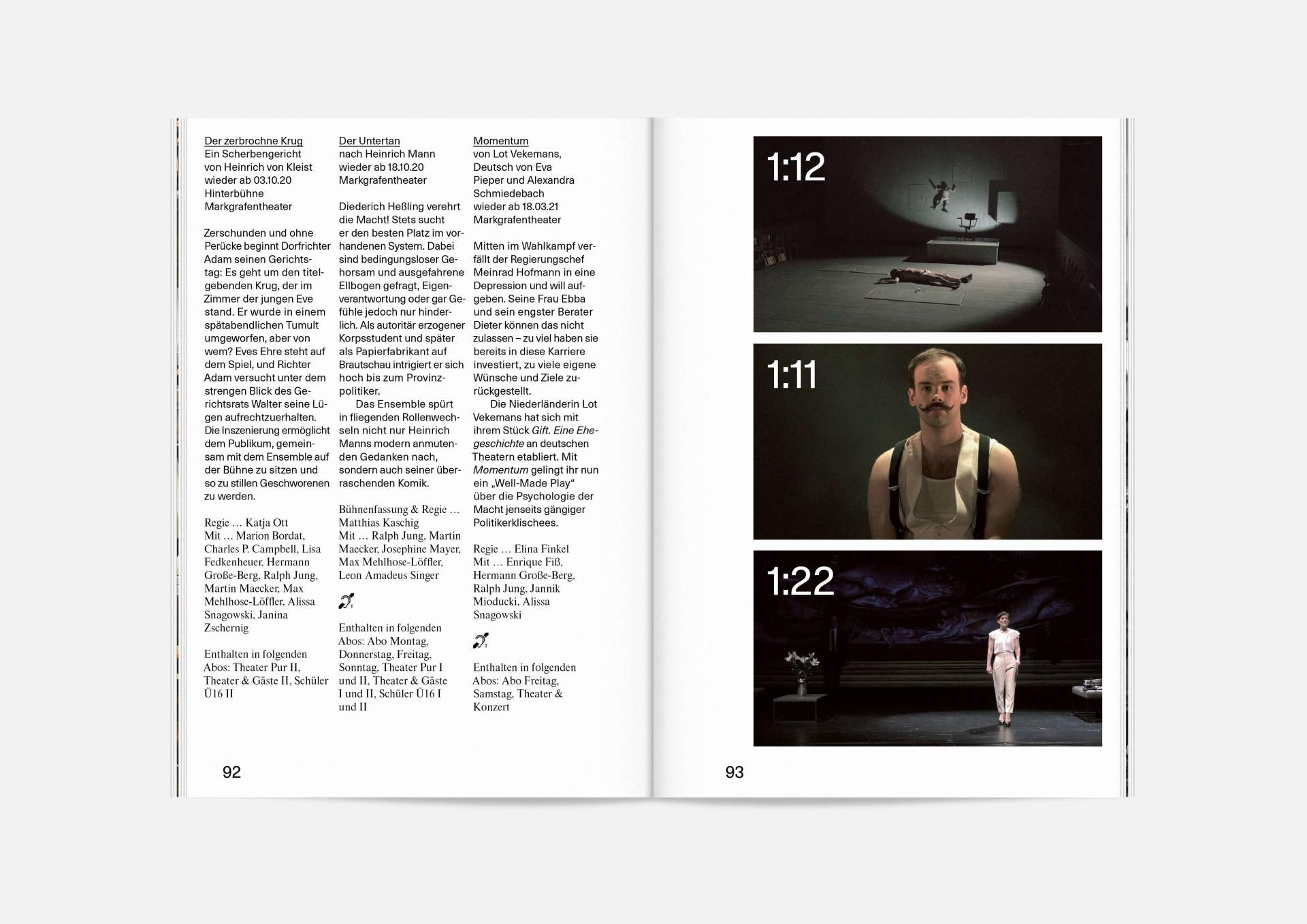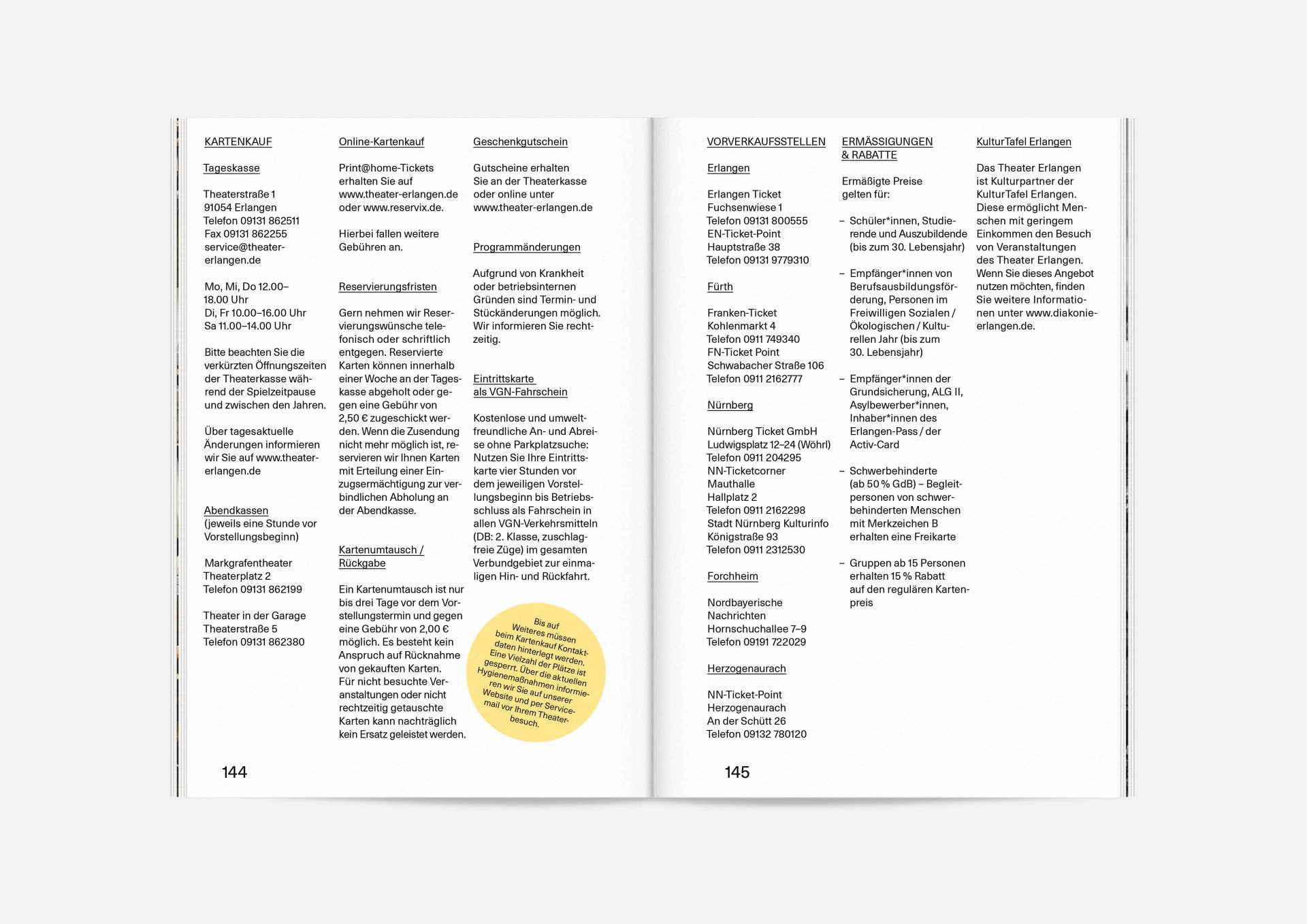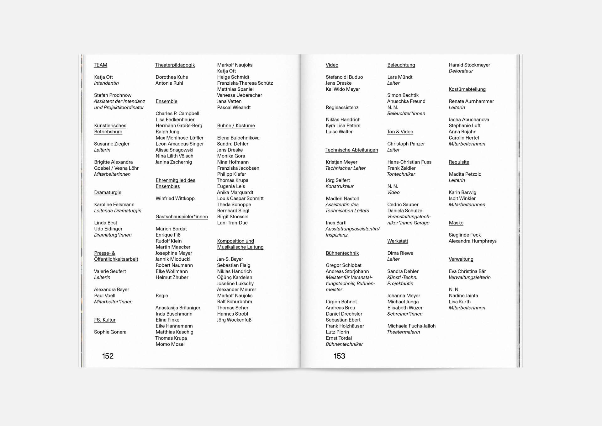 The program booklet is available for the current season 2020/21. Softcover, format 165 × 240 mm, 162 pages, font type Neue Haas Unica Pro, printed on recycled paper.
