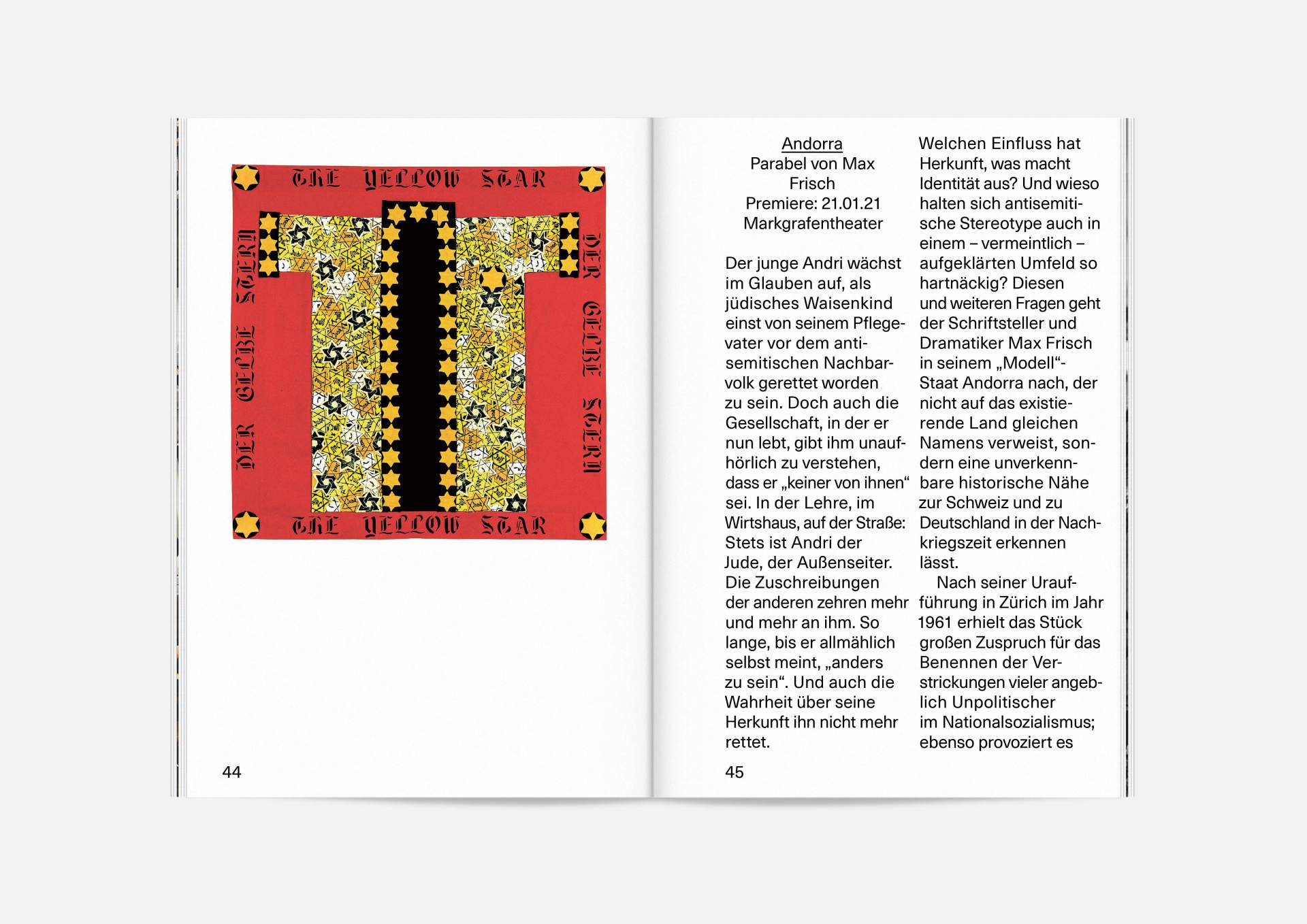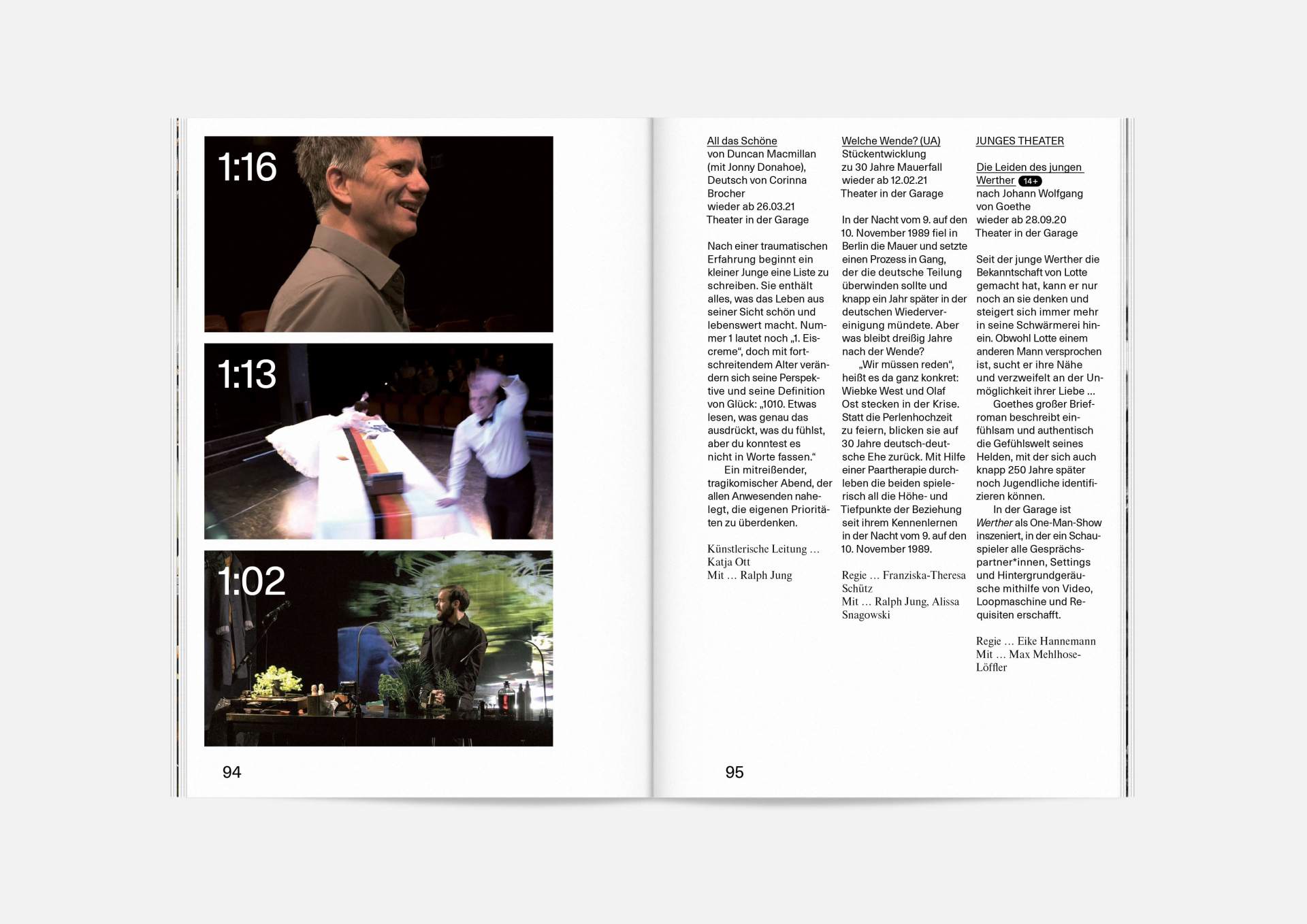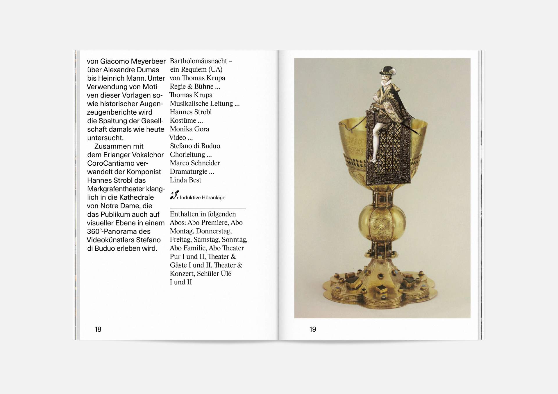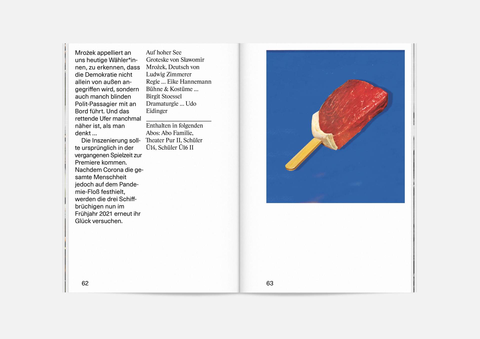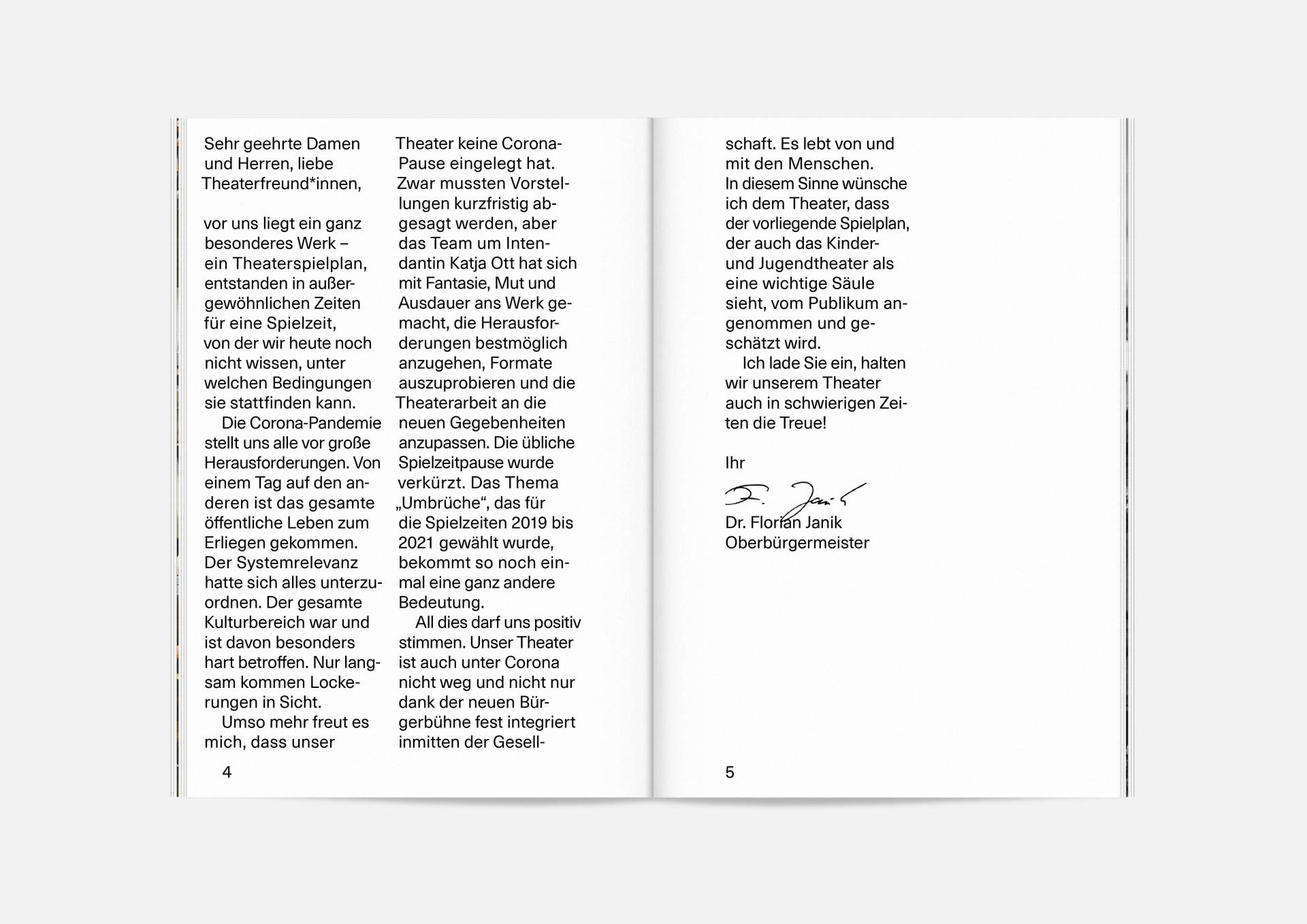 The program booklet is available for the current season 2020/21. Softcover, format 165 × 240 mm, 162 pages, font type Neue Haas Unica Pro, printed on recycled paper.